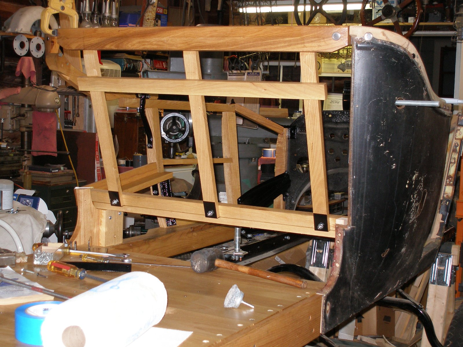 You are misunderstanding my semantics. The vertical (at least the far left/right) members must be to the passenger (originally stated "inboard") side, and the top horizontal board must be outboard or rearward, toward the sheet metal. This is what sets and creates the rigid foundation to the rear sheet metal. The little (approx) 1x1 strips are merely the tack strip for seat and top and provides little real support for sheet metal, and they are placed outside of the metal surface.