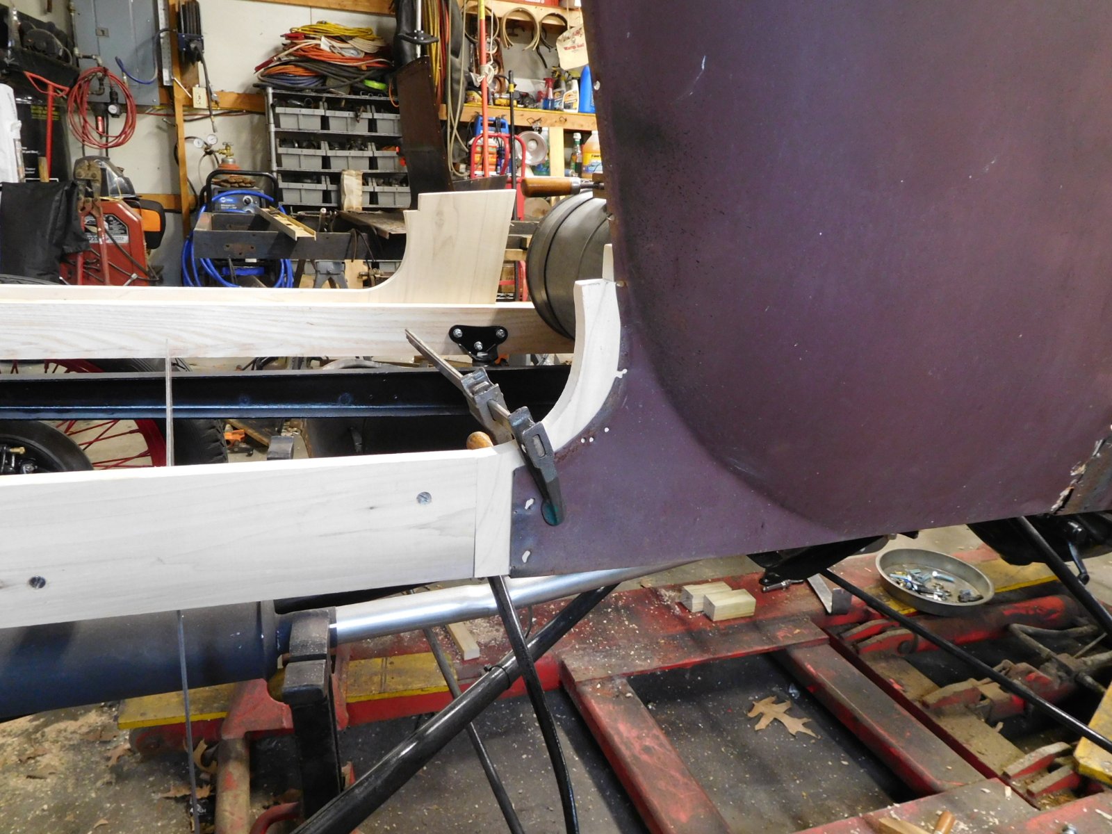 Should look like this. Note picture #3...I rejected this as an error as I removed material near the top which would have left a gap between the body and the trunk...this part got remade and I failed to take that picture...I did my own wood so had no one to blame but myself. You will be hanging metal countless times as things get adjusted. For those who notice, the drywall screws are for fixturing. I used flathead wood screws for final assembly. This is a '23 and I make no claims that your body will or should lay out like mine, though this should give you a clue as to what it should end up like: