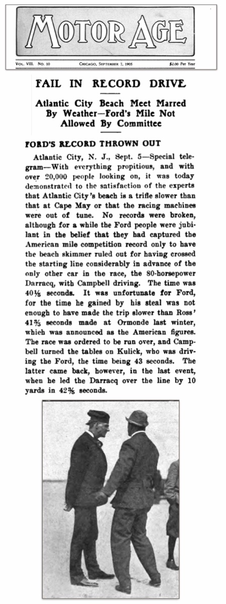 There were three iterations of the six cylinder racer. Although few records were made, there were many close records, such as when Kulick drove the 1905 six to a world record against a Darracq at Atlantic City. The record was disallowed because Kullick crossed the start line ahead of the Darracq (flying start). Below, Henry Ford at Cape May. Darracq protested and the record was withheld. This racer did set the beach record at a mile in 38 seconds, and tied the world 1 km record, although the world record holder, Walter Christie, broke his record the same day: