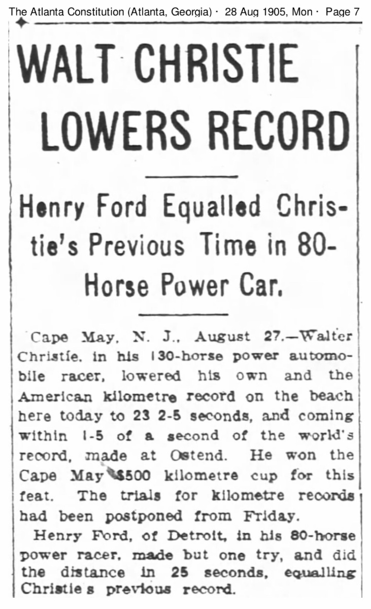 There were three iterations of the six cylinder racer. Although few records were made, there were many close records, such as when Kulick drove the 1905 six to a world record against a Darracq at Atlantic City. The record was disallowed because Kullick crossed the start line ahead of the Darracq (flying start). Below, Henry Ford at Cape May. Darracq protested and the record was withheld. This racer did set the beach record at a mile in 38 seconds, and tied the world 1 km record, although the world record holder, Walter Christie, broke his record the same day: