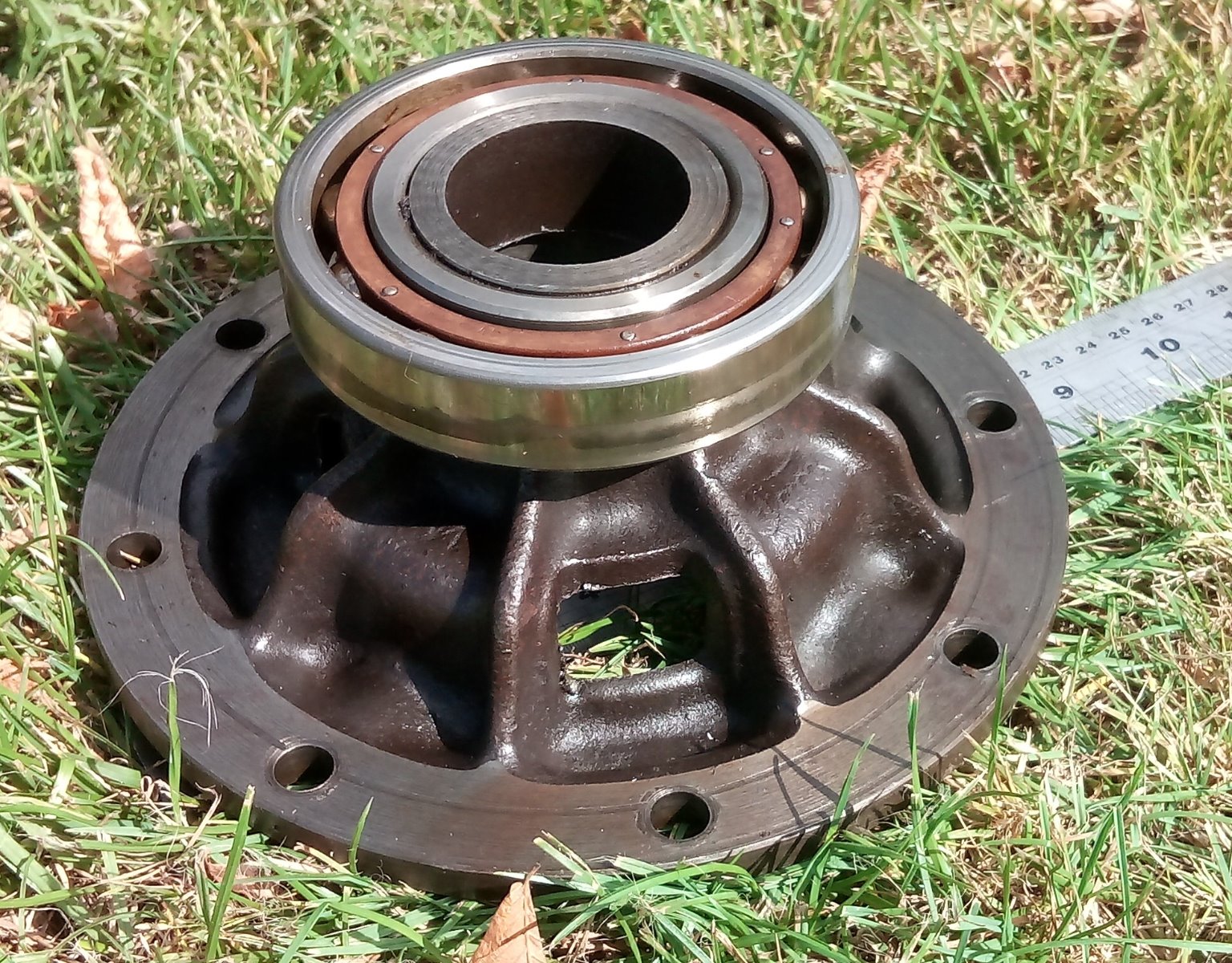 This is the 'cage' that holds a standard axle spider gear together. The bronze gear wheel is sandwiched between two cages and the large ball bearings run in the axle housings.