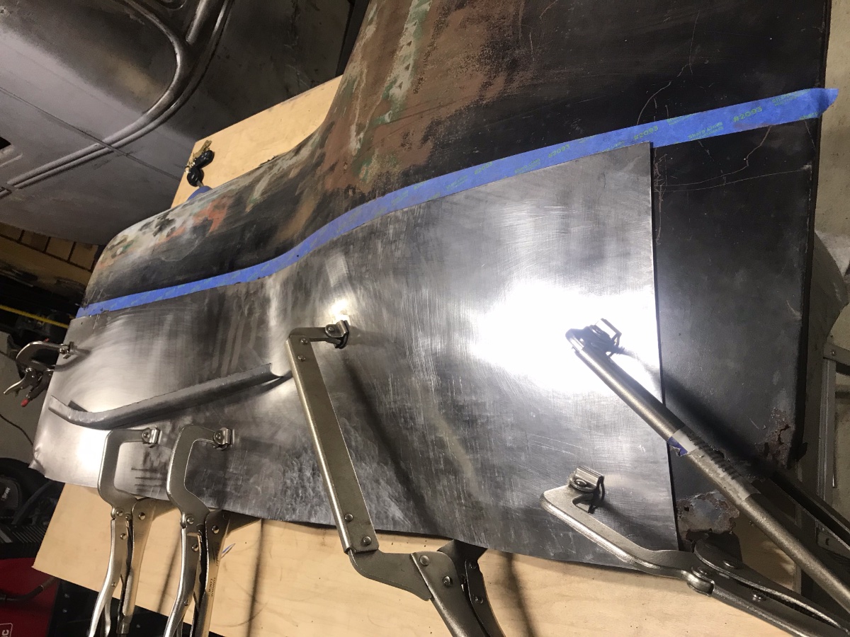 I have kept at it over the last few weeks. I got the wood plans in the mail from Ron Buckley. I have barely looked at them. I have done some more work on the panel I am repairing. Last weekend I added another patch panel. A couple of weeks ago I removed the back panel so that I can repair the rust on that panel and figure out what wood I need to replace. A pending project is address any rust that might be in the gas tank. It looks good as far as I can see, but I can't see much. There was some rust rattling around inside. I will put some gravel or other material in side and rattle it around to see what comes loose.