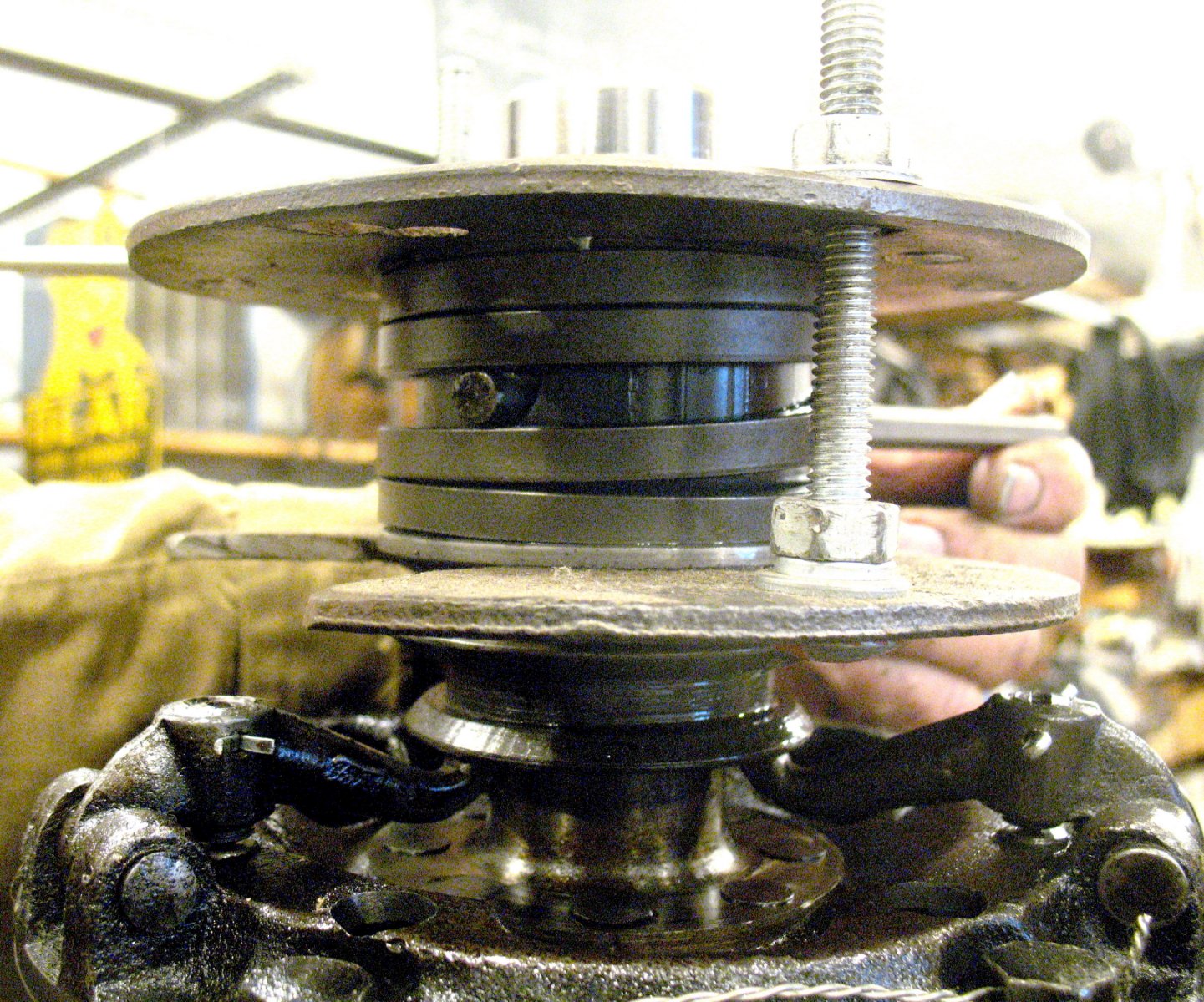I'm disassembling two rear ends to make a good one for my car. It looks like this bearing sleeve is probably original. The upper surface is worn through and the "V" split is closed. My sleeve removal tool was not useful in this case. It took a hammer, chisel and vice grips to get this out.