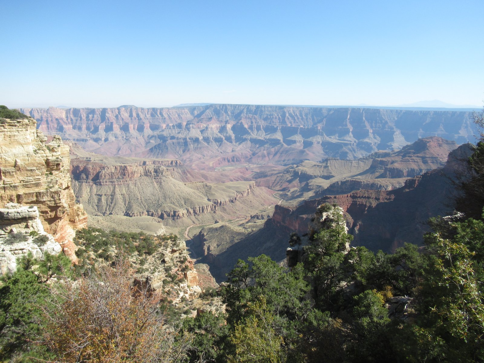 The difference between the south rim and the north rim averages about 1200 feet. The highest point on the south rim, Grandview Point, is at 7400 feet. Imperial Point, on the north rim, is at 8800 feet. This is why the south rim vegetation is dominated by junipers and piñon pines, and the north rim has a lot of ponderosa forest. From the north or the south, the canyon is an amazing sight.