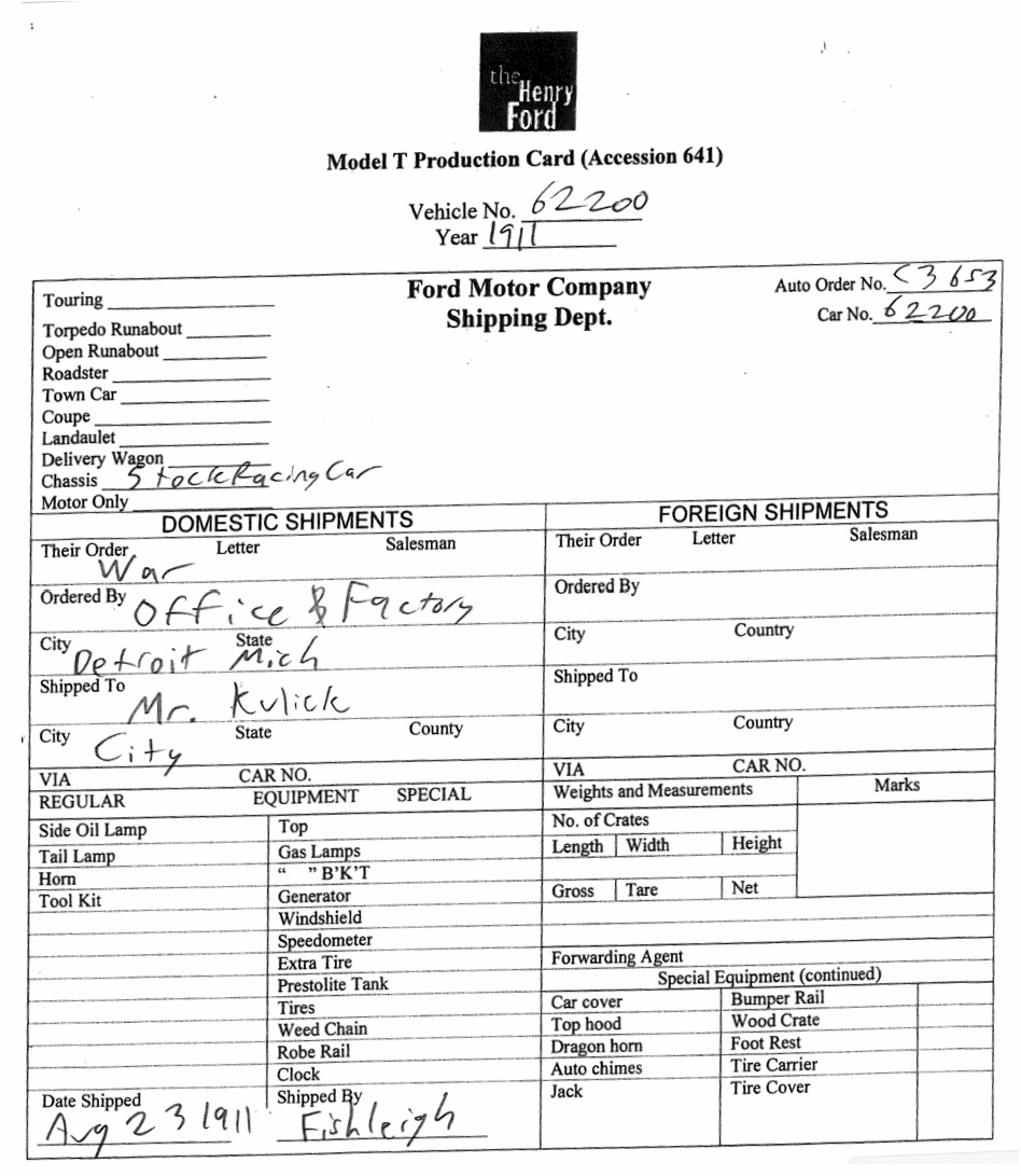 Ford did compete in a few road races with stock chassis. One example was the 1911 Elgin road race. Several classes raced, and the stock Ford completed in the 161-230 class. The course was about 8 1/2 miles long. Only three cars competed in the class, two Abbott Detroits and Frank Kulick with his Ford. We probable know the chassis used, #62,200.
