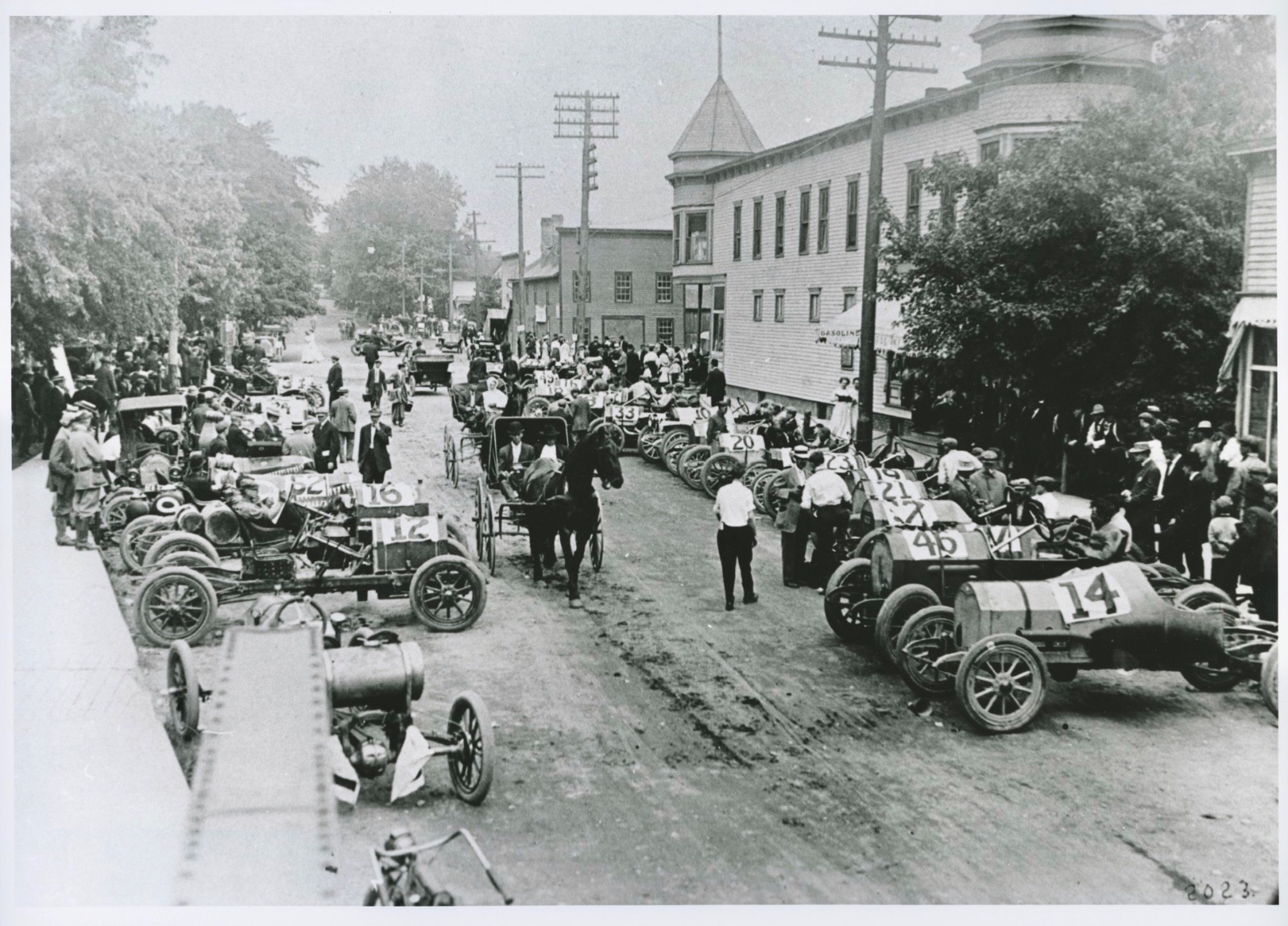 Below is the list including hill climb numbers, makes, bore/stroke and cubic inches and driver of the racers for anyone interested. Farther down the street is stock Ford #3, and it looks like a Model T driving away from the camera.