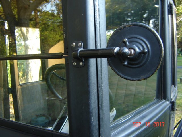 It looks very much like the side mirror on our 1922 Coupe with the doors that open at the front. After the mirror is adjusted properly so that I can see what is behind me, I can swing the door open,and the door misses the mirror by about 1/4 to 1/2 inch.