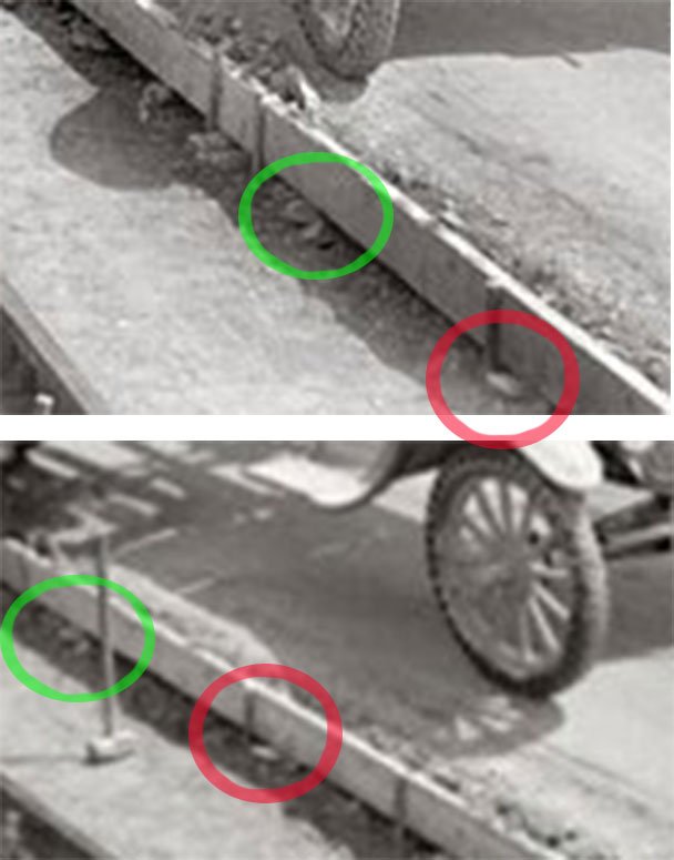 Silly me, I decided to figure which of the two pictures was taken first or second, and about how far apart. The sledge hammer standing almost identical, along with the shovel handle sticking up from the dug trench almost exactly the same, led me astray to thinking the two spots were right together. But I couldn't resolve the form stakes spacing. So I started looking at backgrounds.