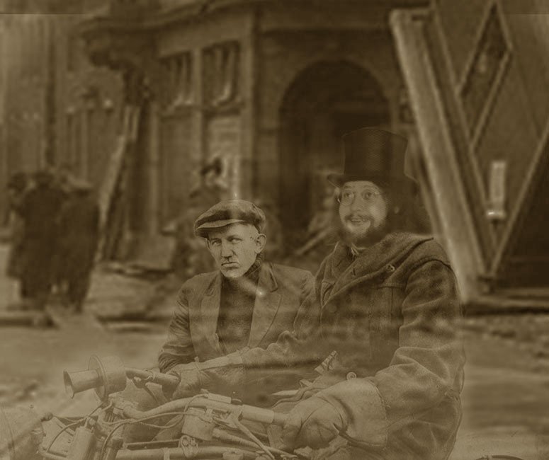 Wrapping up, Oz Moses’ nephew Moses Moses (his folks figured to save on first names) was the Tri-burg specialist in two-wheel transport. His unhappy expression in the above photo was due to the third wheel on the sidecar in which KD was riding. He often said, “If you can’t get it done on two wheels, it don’t need doin’.” He was killed in a tragic motorized unicycle accident in 1936.