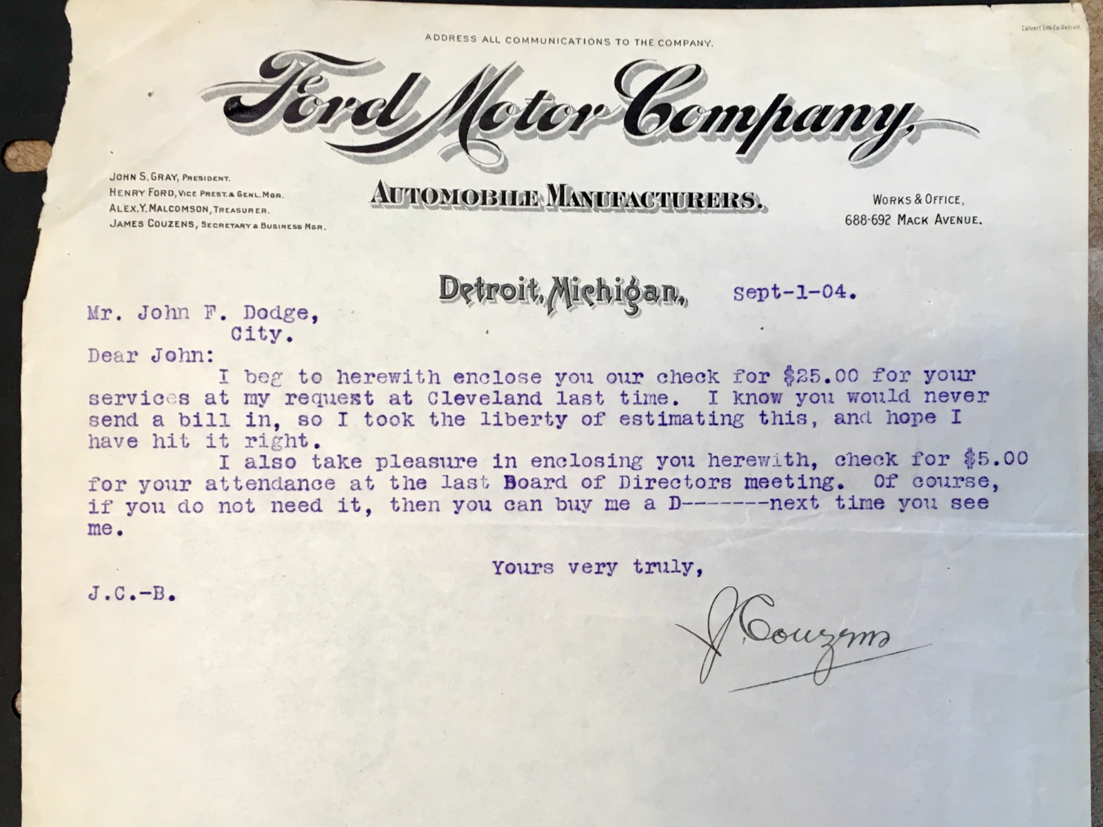 First, a note from Couzens to the John Dodge, reimbursing for service rendered and paying for board meeting attendance. Couzens issues a $25.00 check for service rendered, because “I know you would never send a bill in”. $25 in 1904 is about the equivalent today of $625, so not exactly chump change, especially one year in to the history of the company.