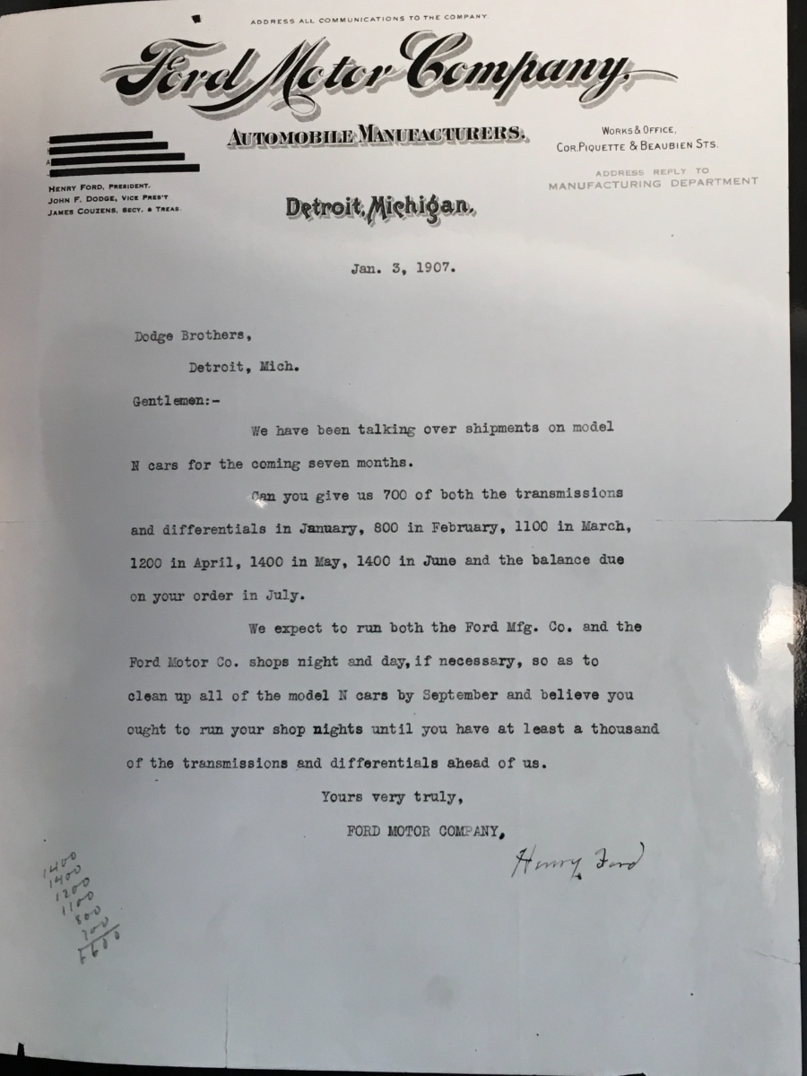 Some historical accounts read that Dodge Brothers were limited to “only” producing Model K motors and components when Henry Ford and investors started “Ford Manufacturing Co.” in early 1906. However, this letter spells out how many Model N transmissions and differentials Dodge Brothers were to deliver for the remainder of 1907. It also demonstrates how Ford was ramping up, as they became the world leader in number of cars produced during 1907: