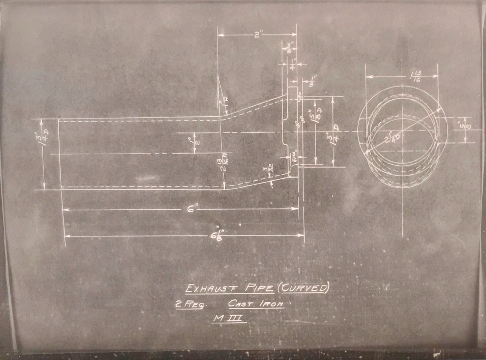 Anyway, the point being, the exhaust must exit the false dashtank. #4 cylinder sits mostly behind the firewall, and is too close to consider running a header forward to exit the hood. Fortunately, we also have the exhaust pipe drawings for M-III. The drawings call for two bent and two straight pipes.