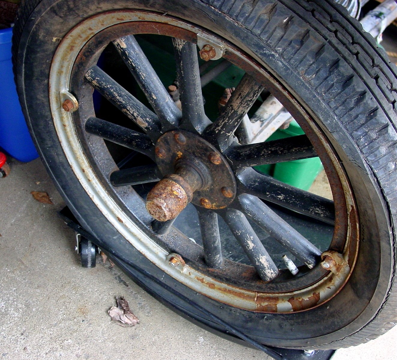 I reread almost all of the posts on this thread and respectfully disagree with one thing that was mentioned. I looked at the photos of your tires and noticed that the tire was badly cracked. I would move the car around the yard with them (I'm assuming that all are in similar condition) but would not take the car out on the road with them. I also saw that someone said that you need a special tool to get the tires off the rims. You do not. I have changed all five tires on my '27 and with a couple of big screwdrivers you can get the tires off. With your mechanical experience it should not be a problem to remove the tire from the rim. You will figure it out.