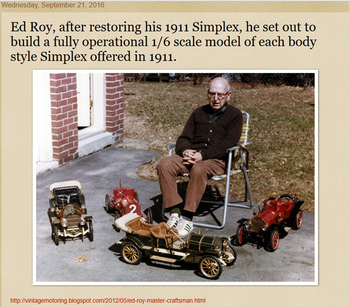 "Edgar Roy devoted much of the latter part of life and the best part of 30 years (and 23,000 hour) building a complete Model Line of the 1911 Simplex."