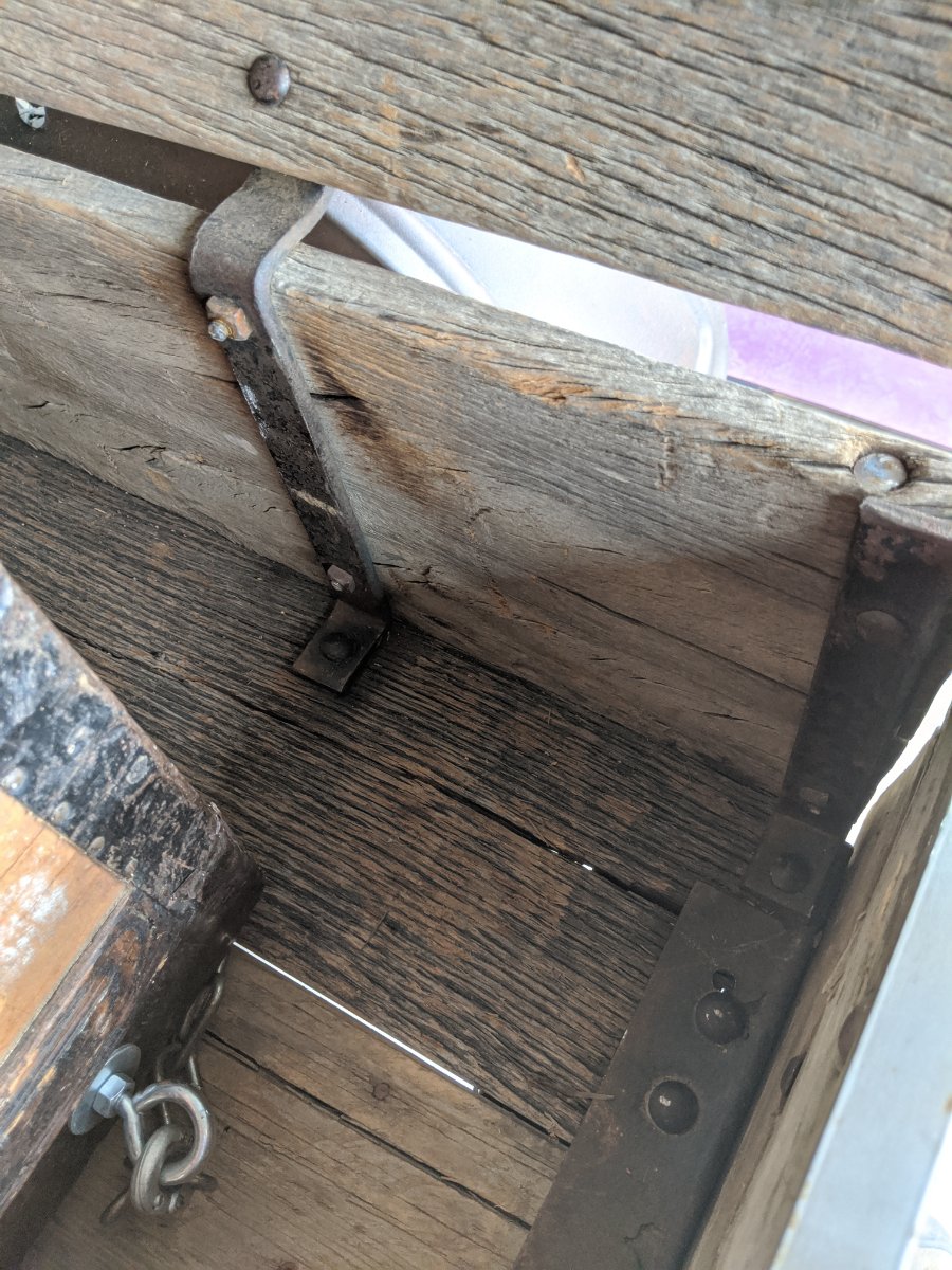 Coach bolts and square nuts, if you can find them, are the correct fasteners, with slotted head screws for floorboards.Just remember the head of a coach bolt goes to the timber, and the nuts outside. I had to make the sideboards for Henrietta's tray and used rusty iron from my scrap heap. Our farm fences used to be built with wooden post about a chain apart and two or three flat "droppers" of 1.25 x 1/4" flat steel to keep the plain wires spaced. These old irons are ideal for the hinges.