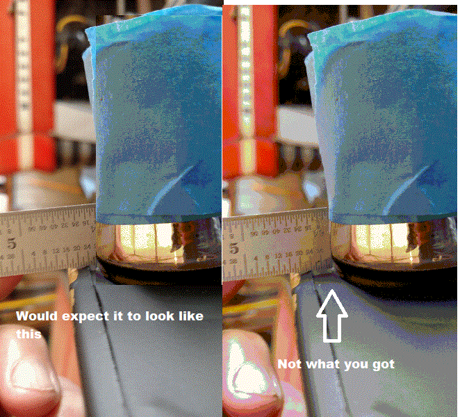 A piece of wood is used for the straight edge and there is daylight visible. The wood may be warped or the tank may be malformed. Can't say but would not rely on that for a dimension.