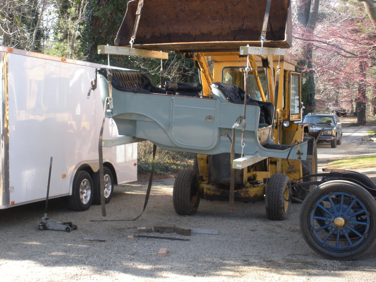 I'm almost ready to mount my 1910 Touring body onto the chassis and need some suggestions as to the best method to accomplish this. The body is still out west with Ray Wells, and until the stay-at-home order there is lifted he cannot ship it back, but I'd like to have an idea as to how to mount it onto the chassis as carefully as possible. It is completely refinished with a brand a new interior, so I imagine it will be a tad heavy. I've thought about just asking some friends over to heft it up and over but we would have to lift it past the gas tank, which sits fairly high. Maybe taking off the wheels and lowering the frame down would help. I do have an overhead chain fall, but my pole barn trusses are not super high so I'm not sure the chain fall could lift it high enough. Besides, I'm thinking if I attached four straps under the body and hooked them on the chain fall it may buckle the sides in. Anyone with experience mounting an early touring body I'd sure appreciate your input - thanks!