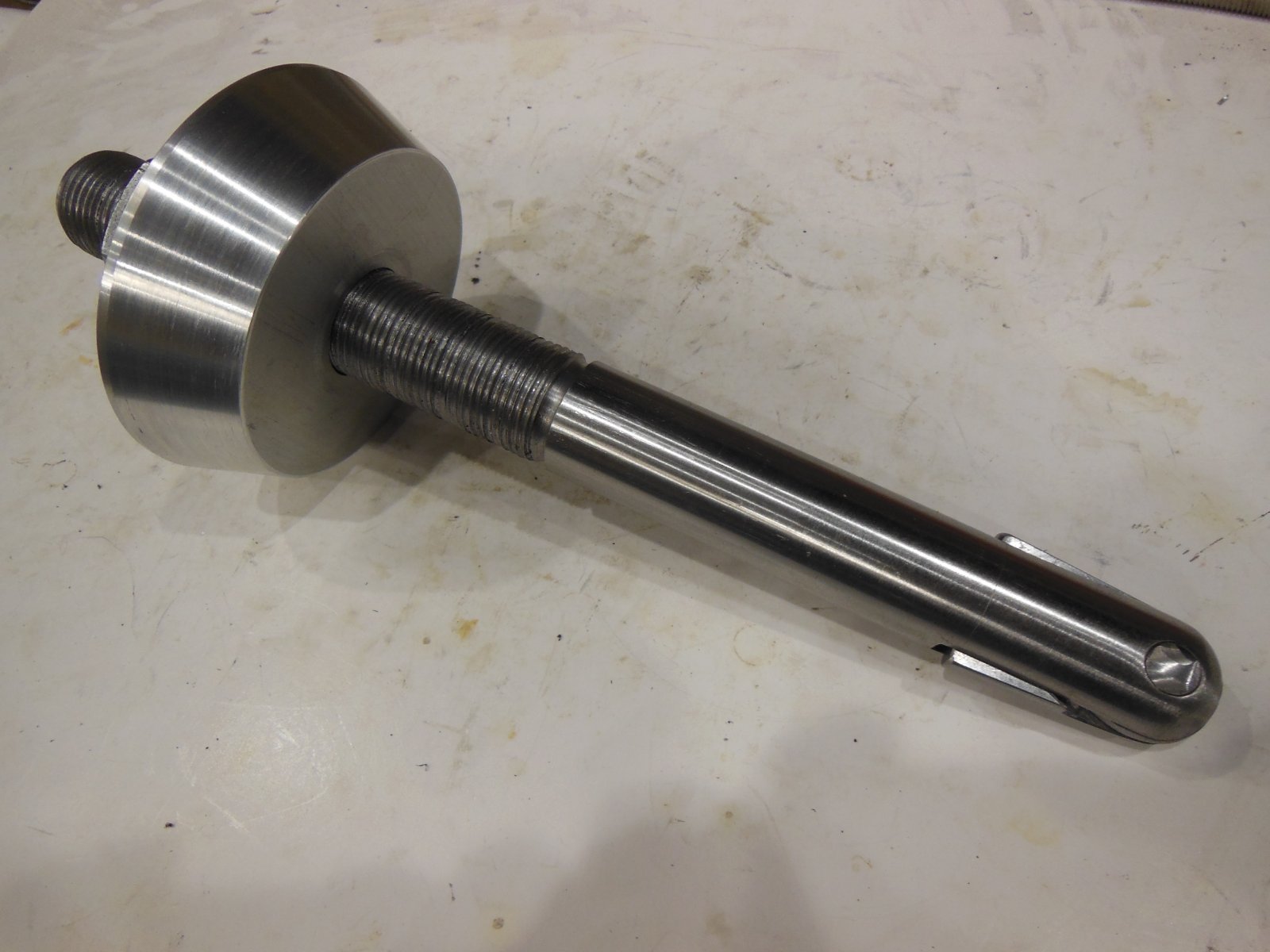 Scott, The shaft is a left over 1" PH 4140 with 16 TPI. The fingers are scraps of A2 and hardened by eye. The spring is from a ballpoint pen and too soft, so I have to wind one from piano wire. The spring doesn't have to do any more than extend the fingers after It goes through the hole as the fingers have a 5 deg. angle to hold there position and hold the load. The pressure cone is a donut hole from a 1 1/2 7075 plate. All materials are left over from previous commercial work.