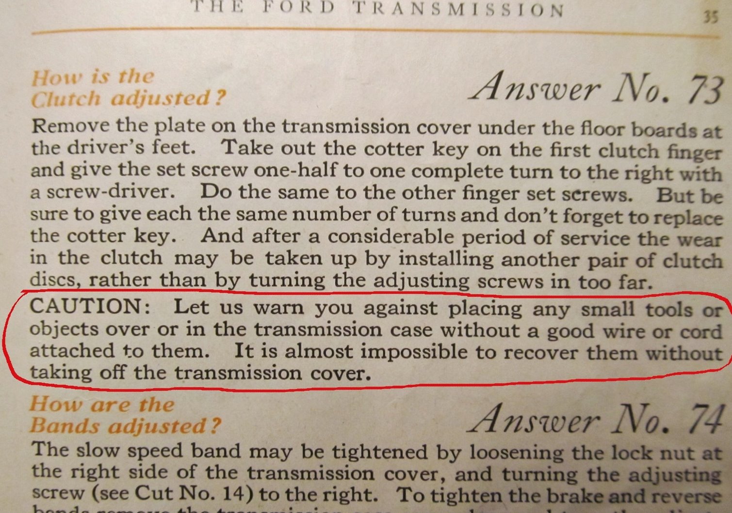 This post reminded me of when I was changing bands many years ago on a Model T for the first time. Not being careful enough I dropped a band nut down into the transmission. I removed the hogshead, stuffed a rag between the ring gear and the transmission housing and turned over the engine by hand. the teeth on the ring gear caught the rag and as it rotated around the rag brought the nut up with it, much to my relief. Needless to say i never let that happen again.