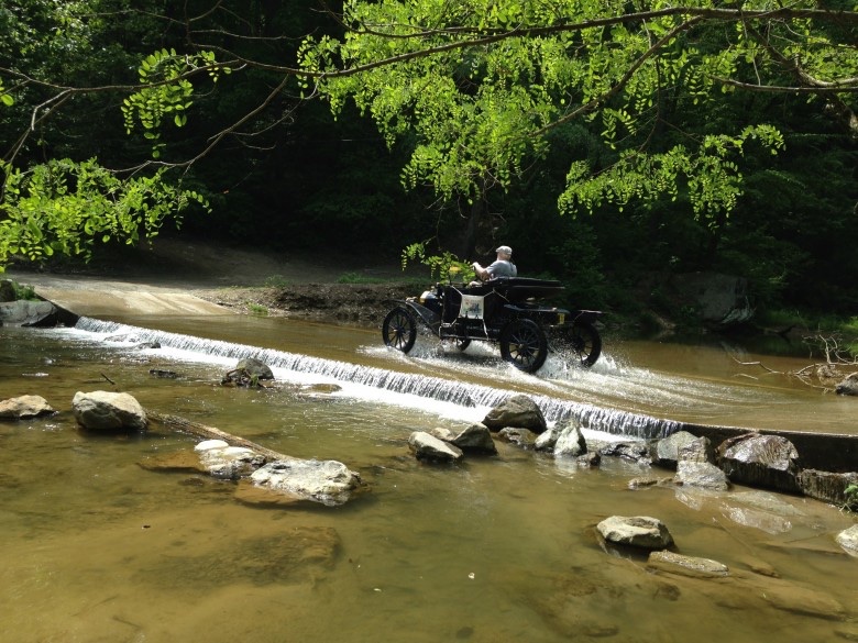 The touring car is Peter Jakab's. The buggies are Amish; this is a typical scene if you tour in Lancaster County. The third picture was an ice cream stop way out in the boonies on a dirt road; the tour director had brought in a classic Good Humor truck. My T is in the foreground. The other car is a 1910 E-M-F that I owned 50 years ago. The last two pictures, in reverse order, are my car approaching a paved low-water crossing, and driving across it.