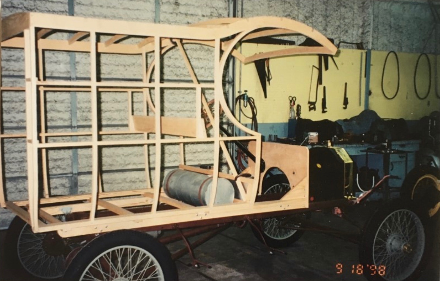 A few pics showing the rolling in the body. It is a oak skeleton with aluminum skins. Not original, but the general form to my design. Wire wheels are my preference also.