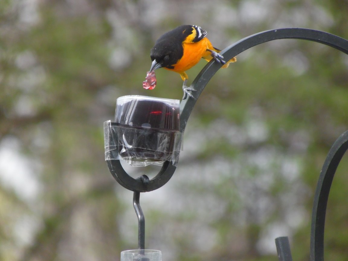 We put out grape jelly on our bird feeders to attract Baltimore Orioles. Yesterday, through dumb luck, I got this shot: