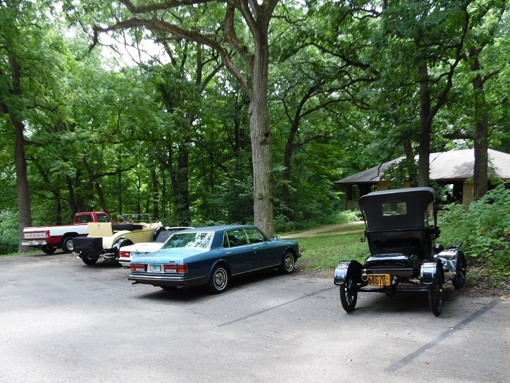 Everybody is familiar with Pikes Peak in Colorado. For those of you who think Illinois is flat as a pancake, I want you to know, here in Kane County, IL., we have our vary own "Johnson's Mound" which is the highest point in Kane Co. and rises to an astounding elevation of 867 feet above sea level! This is about 200 feet above the surrounding corn fields, so it is certainly a site to behold! So take that, Colorado! On a clear day you can see all the way to DeKalb County. Well you could if there weren't so gosh darn many trees in the way. At any rate, this summer a group of my car crazed friends of all persuasions, have gotten together bi-weekly at the picnic shelter at the top of Johnson's Mound for a "Social Distancing - Self Picnic". On the first picnic I neglected to make sure my low band was properly adjusted, and so I need a little "help" getting to the top. Here are some photos from past picnics. My T is the one with the rope attached to the front axle. Most of the cars that show up are from a different decade. If you ask the man who owns the blue Packard, he will tell you how he purchased the car at 14 years old with savings from his paper route. He gave $700 dollars for it, which was the market rate at the time.