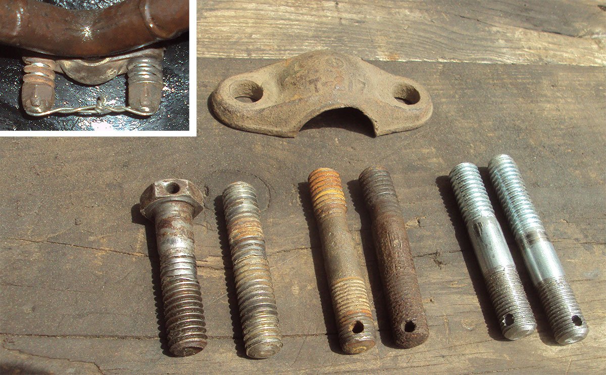 I could have had it back on the road but I'm taking time to clean things better and improve some areas. I have been cleaning all the electrical connections without disturbing the old tattered look outside such as the starter terminal. My plug wires look shabby but there is good continuity so I just clean the connector centers. We talk about choices. The bolt and stud at left were my first quick fix to hold the wishbone cap. I hadn't planned on driving the car that much so it seemed OK. A better choice now would be to use my original studs (center). I like to have original parts if practical. But as I won't be seeing them and one hole was stripped and tapped deeper I made two new studs to go there. The old studs have grooves worn by the cap and tired old threads but they are great patterns.