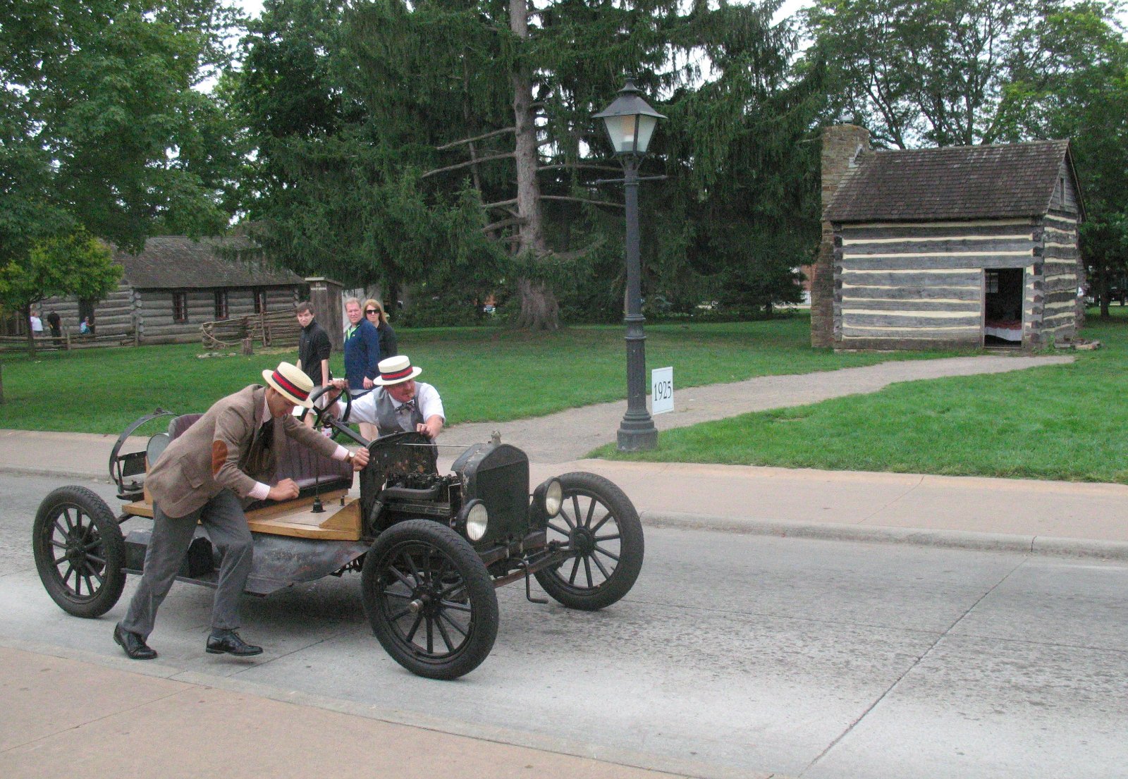 By the time I got to Madison the symptoms of fuel starvation had reached the point where I had doubts about getting to the next town, so I pulled off under a tree and set about an investigation of the carburetor. This is the first time I've used a Holley G, but I seemed to remember that proper float valve setting is not by measurement, but by removing the top plate and watching to see that the little pipe inside is sticking down into a puddle of gas at the bottom. If there ever was a valid setting by measurement, using the new float material instead of the original brass probably cancels it. While I was working on the carb some local guys stopped to see if they could help. When I finally got the carburetor back together and on the car, Billy Cullom (on the left in the picture) did some of the cranking while I waited at the spark lever in case the car actually started. Eventually we got it to start reasonably well and I headed for Moberly. The car still isn't exactly right, but it now cruises much better, even on hills.