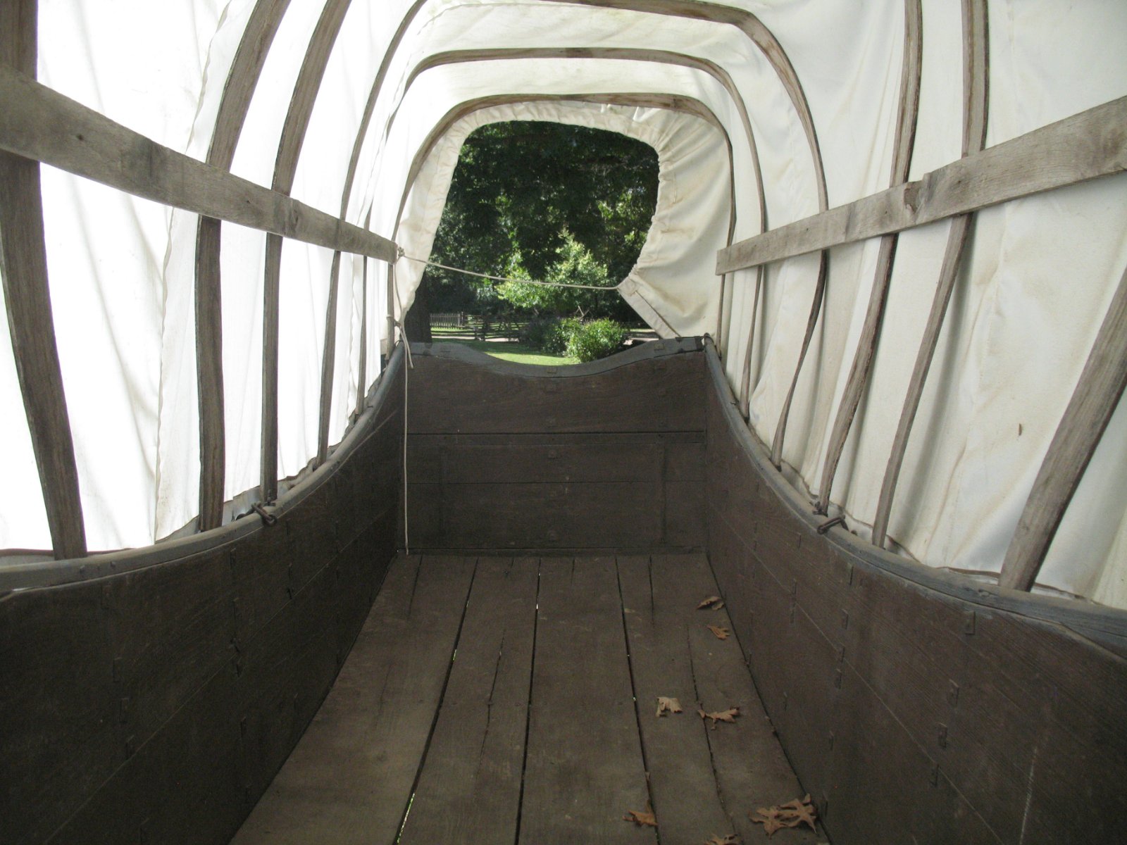 Conestoga wagon. The bed slopes down from both ends to the center to stabilize cargo.