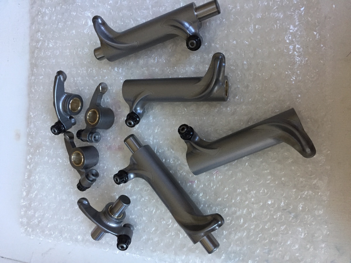 The rockers were machined from normalized chromoly steel and I had a concern about material hardness at the valve stem friction surface. RAU flame hardened the tips of the rockers, bead blasted, bushed, honed, and ground the tips, all with beautiful results. They also set me up with the new adjuster screws, and all for a quite reasonable price.