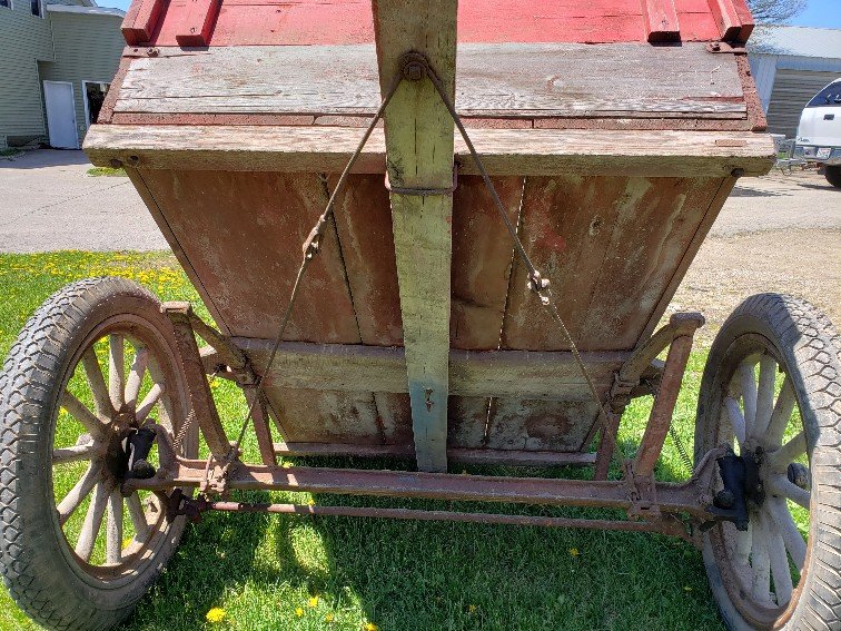Looking through the local ads online today and this was just posted yesterday. Only an hour away so I had to buy it before some "yard art" person let's it outside to rot. It was purchased from an older couple that brought it from their neighborhood when he retired from farming back in 2000. His dad had made it for use on the farm. The axle is an Overland and I love the old reflectors and slow moving vehicle symbol painted on the back. I will clean it up, repair only what needs to be, and then "paint" it with Penetrol to keep the original paint and patina. It has an Acme style ball hitch so I would love to hook it up to a TT and see how she goes! I had to give $200, but I don't think I did too bad on the deal. I'll post some pictures when I'm done with it.