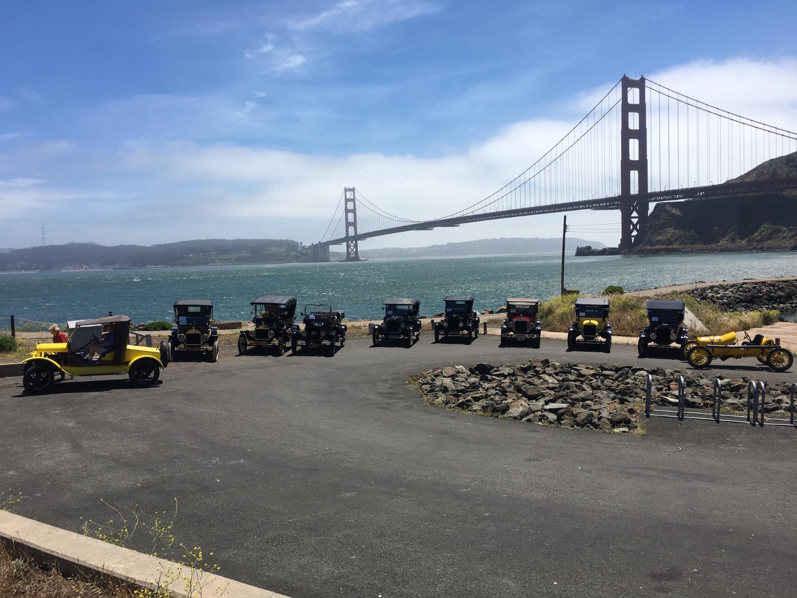Today we had perfect California weather for our trip to the famous houseboat communities of Sausalito. We then crossed the Golden Gate Bridge and onto the historic San Francisco Presidio for a catered gourmet picnic on the parade grounds. This was followed by a circuitous tour of this army base, that has proudly protected San Francisco since before WW1. We then toured some of Pacific Heights most impressive estates before crossing back over the Golden Gate and landing once again at the Trident Bar on its rickety old wooden pier overhanging the water with bay views of Alcatraz Prison, Angel Island and the City of San Francisco. Our Ts had no problems other that one low band needing 3/4 turn tightening. Tomorrow we leave Mill Valley for our new home in the Alexander Valley wine country. This tour will wind through Marin and Sonoma Counties golden grassland hills and will be the most remote and scenic drive yet. Wish us luck.