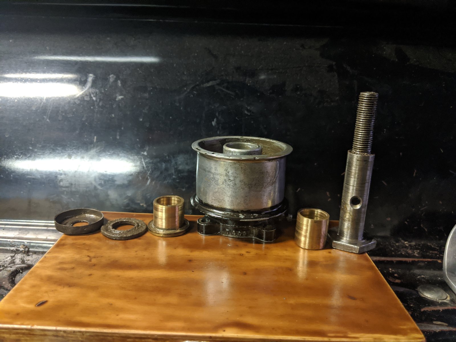 . . . isn't that front bushing supposed to be flanged? And if so, could that bushing sliding backward on the shaft have been the cause of the dreaded wobble?