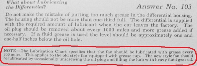 There should be a gasket between the fan blade and the fan pulley at the front, and a felt washer at the rear between the hub and the cupped washer.