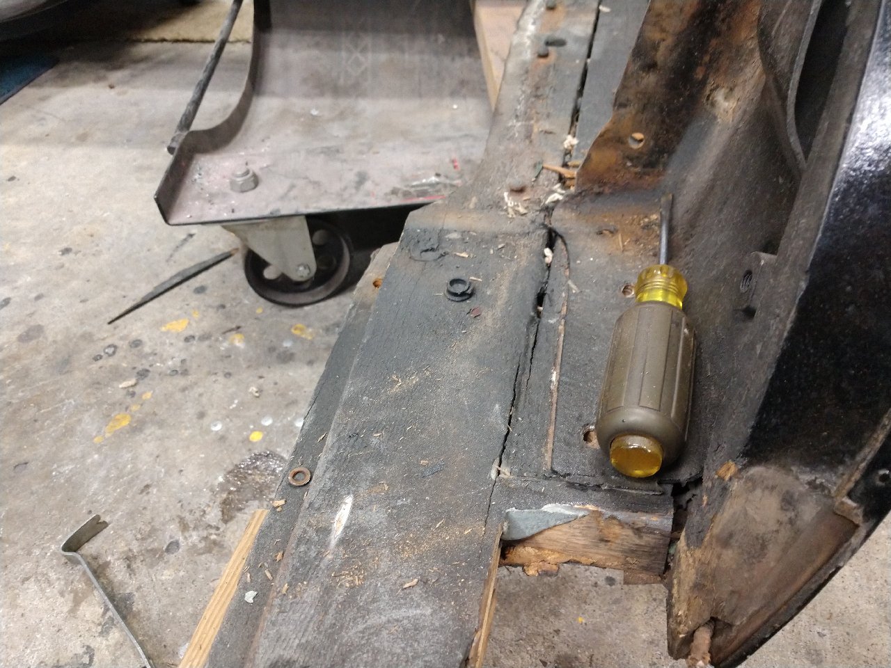 I've mentioned on prior posts about the main-rail crossmember tenon wear. Here is a perfect example of just that. The main-rail outer edge has settled more than a 1/4" on both sides of the car. This may seem minuscule but when the time comes for the final fitting and door operation it can make for a frustrating reward for a heck of alot of work.