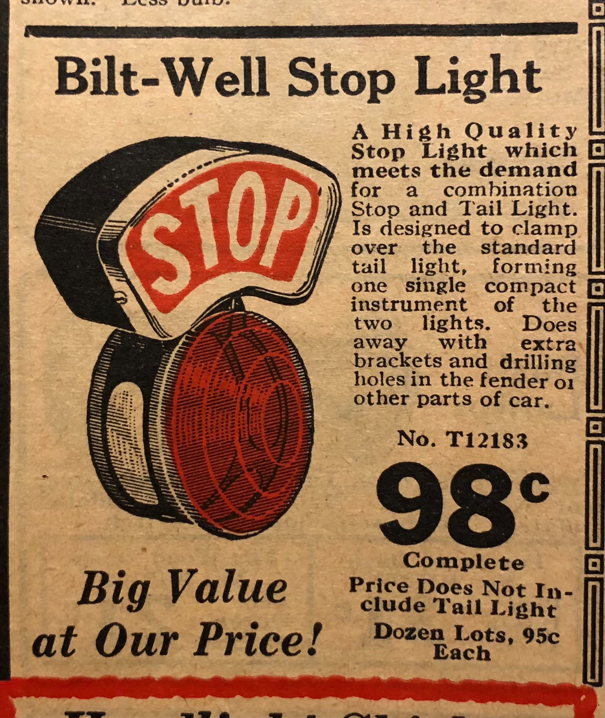 That would be neat to restore and use again! But finding the red glass lens for the add on stop light would be almost impossible. Maybe a red celluloid lens was used?