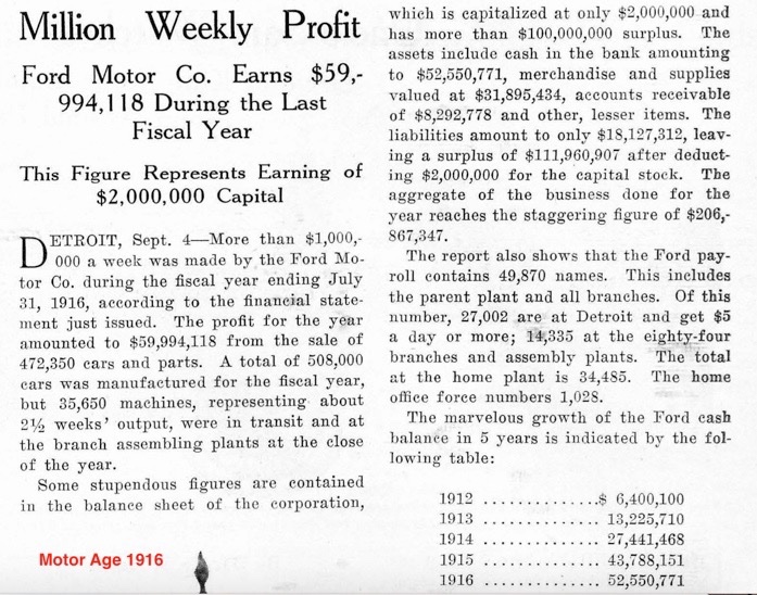 Just quite unbelievable the numbers of Ford cars produced in the 5 years after the assembly lines, and branch building for assembly of T's at the point of sale across the country. And a pretty hefty earnings too ;) That stockpile of cash, even with annual car price reductions , was then used to build additions to Highland Park plant, and the planned huge River Rouge plant for building the millions of T's to come.
