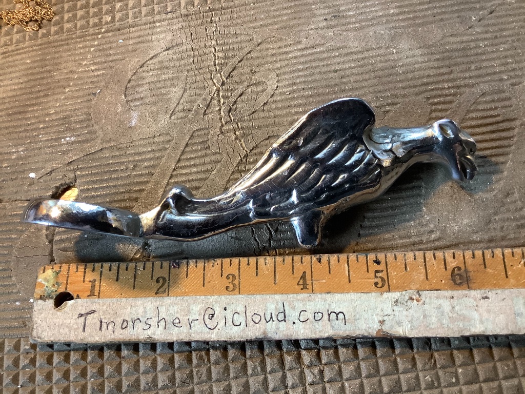 Since it goes on a car with an exterior radiator instead of a car with a hood, it must be circa 1920’s or early ‘30’s. It looks to me more like a mythical winged griffin than a gargoyle. The Mobil Oil logo was Pegasus, a winged horse. I did a search on griffin radiator ornaments and found one similar. Jim Patrick