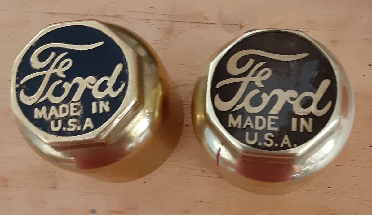 The one on the left is an original high F hub cap found on 15 cars. My home made one is on the right. It isn't a perfect copy.