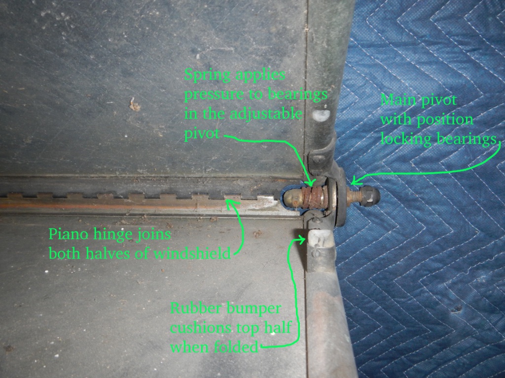 Well, here are some more pictures on the hinges on the windshield in question. From the drawings posted above, the tongue and groove pieces look identical to the Troy. It’s probably safe to say it it a Troy. It has to be fairly early, it has the studs for the windshield braces. I am pretty sure this came off of an early T or at least it was on one at one time whether it belonged there or not.