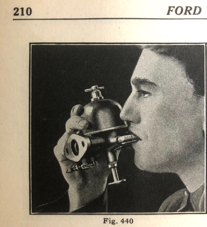 Ignacio. See Dan Treace’s March 14, 4:18 pm post, figure 440. It was a common method found in the Model T Ford Service Manual that Ford recommended mechanics use to test the integrity of the needle valve. The suction should be so good that it will hold your tongue to the fitting. I agree John. The problem is most likely in the needle and/or the seat. Jim Patrick