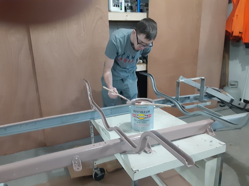 Pat, I forgot to answer your April24 question. The frame was not painted. It was blasted cleaned to bare metal. It does look like gray paint. The primer is going to be Rust-Oleum gray, so I have added two half pints of Rust-Oleum prime brown to have a contrast when painting it.