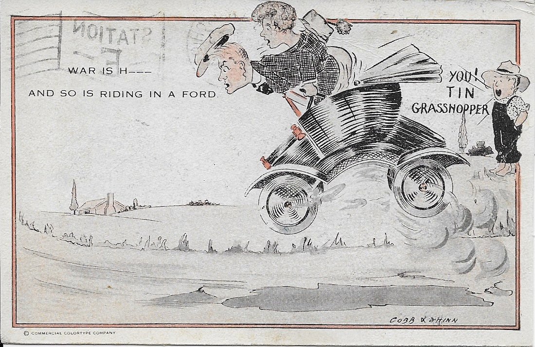 Bryan, the card I posted was from the internet. The difference is interesting. If you do a search of "Cobb Shinn Model T postcard" you will see a variety of color styles.