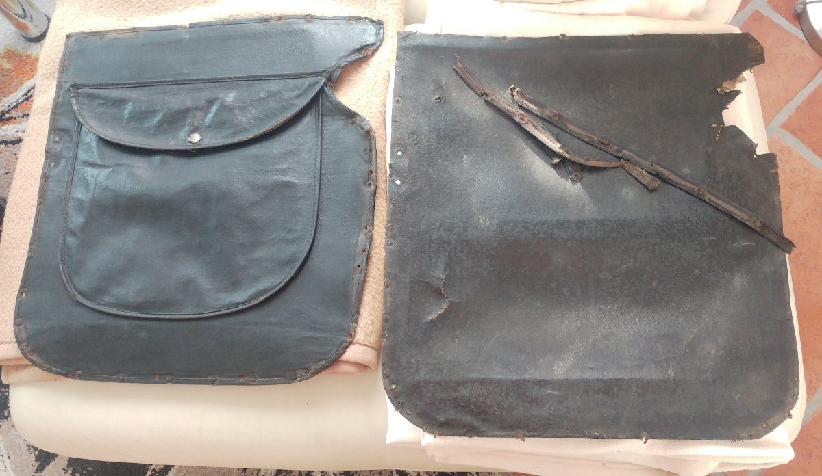 The cardboard is for trash, that is clear. It is warped and has holes kicked in, this cannot be fixed. But I want to keep the front layer (cloth with pocket), it looks very old (perhaps it is original).