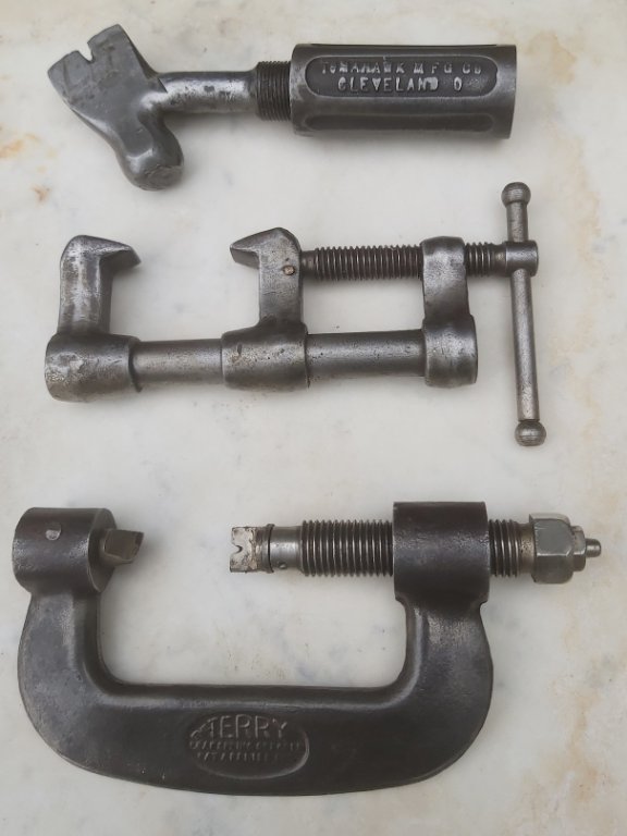 The third is an English tool. The two little anvils swivel to allow them to be lined up with the spring leaves. The threaded piece is cranked in to spread them, and a grease gun is used to pump lubricant in just like the Tomajawk one.