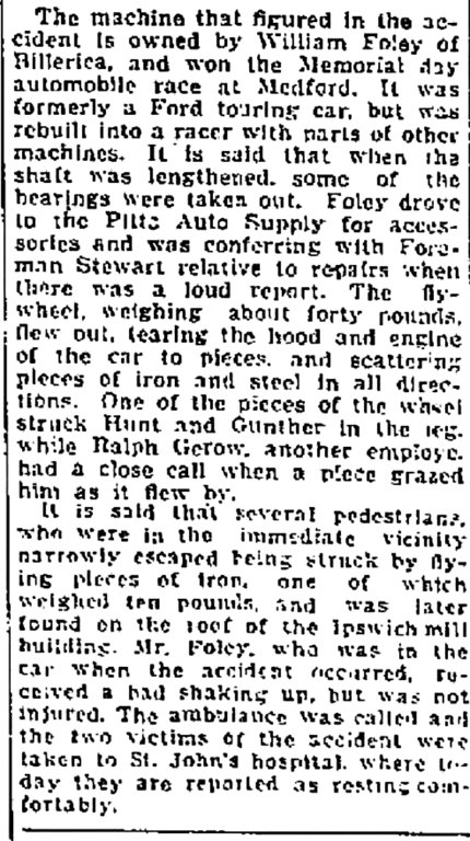 The news story above was found in the June 3, 1921, Lowell Sun newspaper (MA) while doing some racing research in New England. I decided to post this for individuals who have speedsters or racing cars with modified engines and run them today at high RPMs and are unaware of the fact that Ford cast iron flywheels as well as those made by other automakers at the time can explode under these type of conditions.