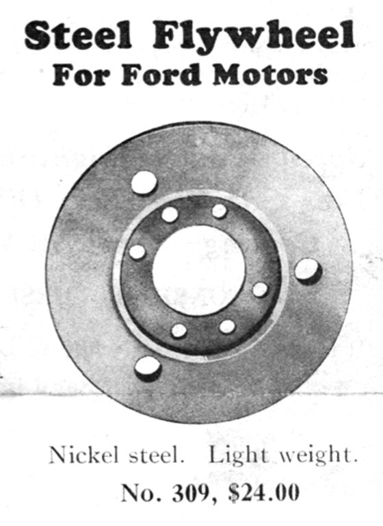 In the period, racers would turn down a Ford flywheel in a lathe to about 10" in diameter to prevent this. It also allows the engine to rev up quicker and improves acceleration. To run safely at engine speeds above 3500 to 4,000 RPM, the "speed merchants," Fronty, Green Engineering, Roof, and others sold small diameter racing flywheels machined from chrome-nickel steel.