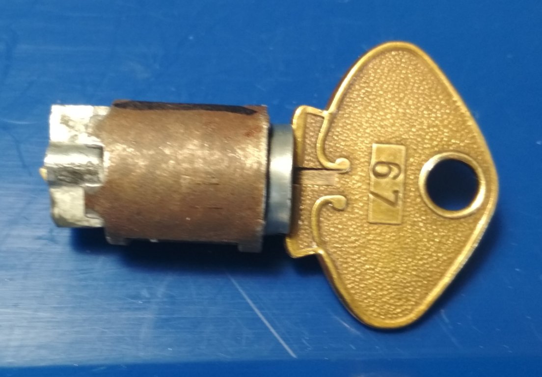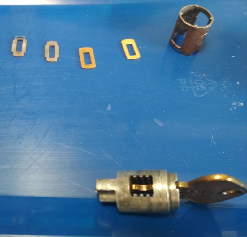 JB Weld to the rescue! (that's cellophane tape creating a kind of mold for the JB Weld). Picked 2 of the new brass wafers (they're all the same) that came with the repo cylinder... ...filed them and got them to fit properly. The marks are to identify the order and positions. The wafers fall into the slot of the sleeve that surrounds the cylinder thereby locking it. The wafers raise up and unlock the cylinder from the metal sleeve when the key is inserted. (excerpted from Locksmithing 101