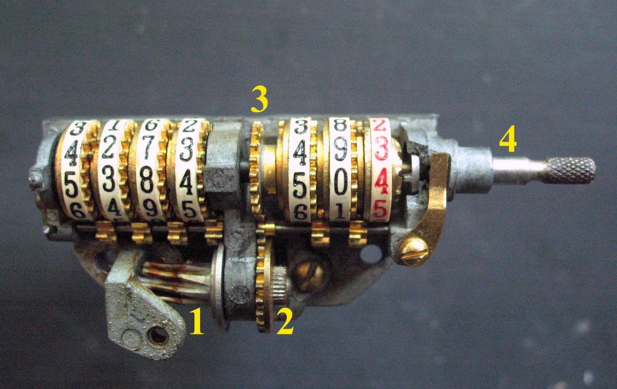 A worm gear (1) turns the big drive gear (2). The trip odometer control (4) is pulled out, engaging the trip odometer main gear (3). In this mode the control is disengaged and does nothing, while the trip odometer is in gear and operates along with the main odometer which shows total miles. When 5384 turns to 5385, 50 will turn to 51.